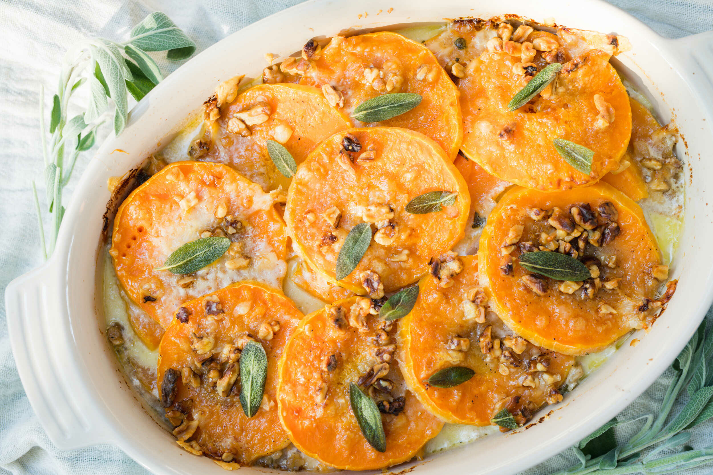 Say goodbye to boring vegetable sides, both at Thanksgiving and every meal after! Butternut Squash Gratin transforms and elevates a traditional holiday side into the creamiest, melt-in-your-mouth casserole ever! The sweet nuttiness of the butternut squash plays with the onion flavors of sautéed leeks and garlic and the rich saltiness of Gruyère cheese. With toasted walnuts and crispy sage on top for a wonderful crunch and a burst of garden flavors, this vegetable dish offers a hearty, rustic feast of the senses... perfect for your holiday feast!