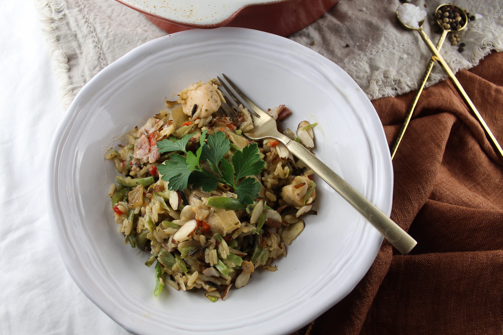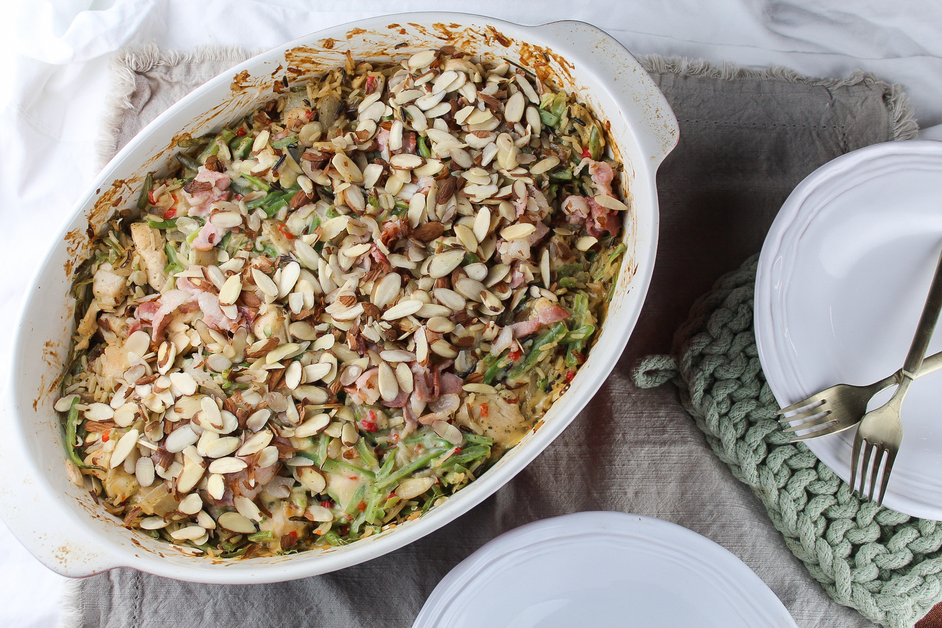 From Creole to casserole, this dish takes your tastebuds on quite the culinary journey! Chicken Amandine Bake places all of those New Orleans-inspired flavors into one dish, from the crunchy almonds and succulent bacon on top, to the savory chicken and crisp green beans underneath. Meaty, creamy, and a little spicy, this Chicken Amandine Bake covers all the bases when it comes to the great tastes of the bayou! Let the good times roll indeed!