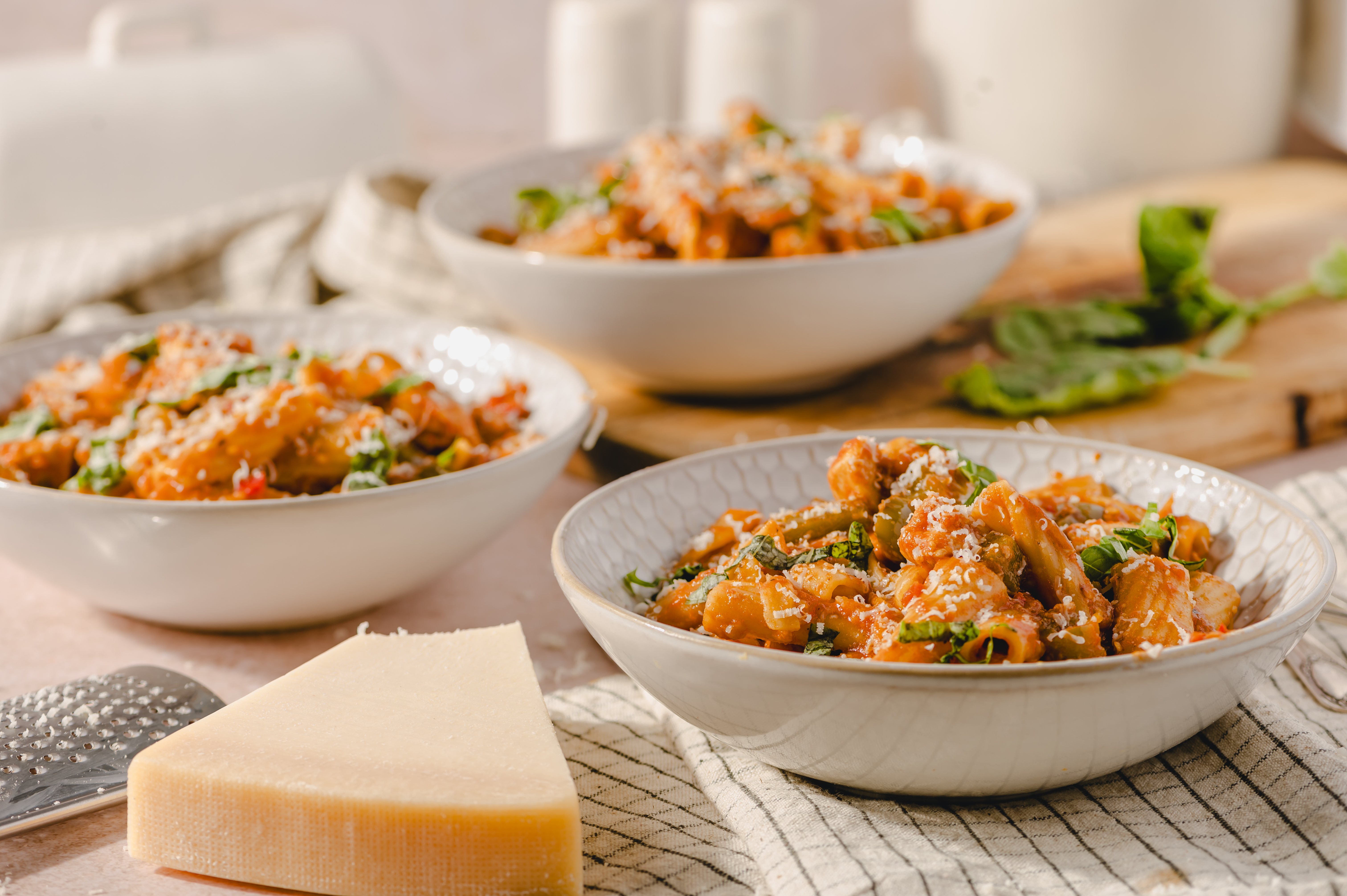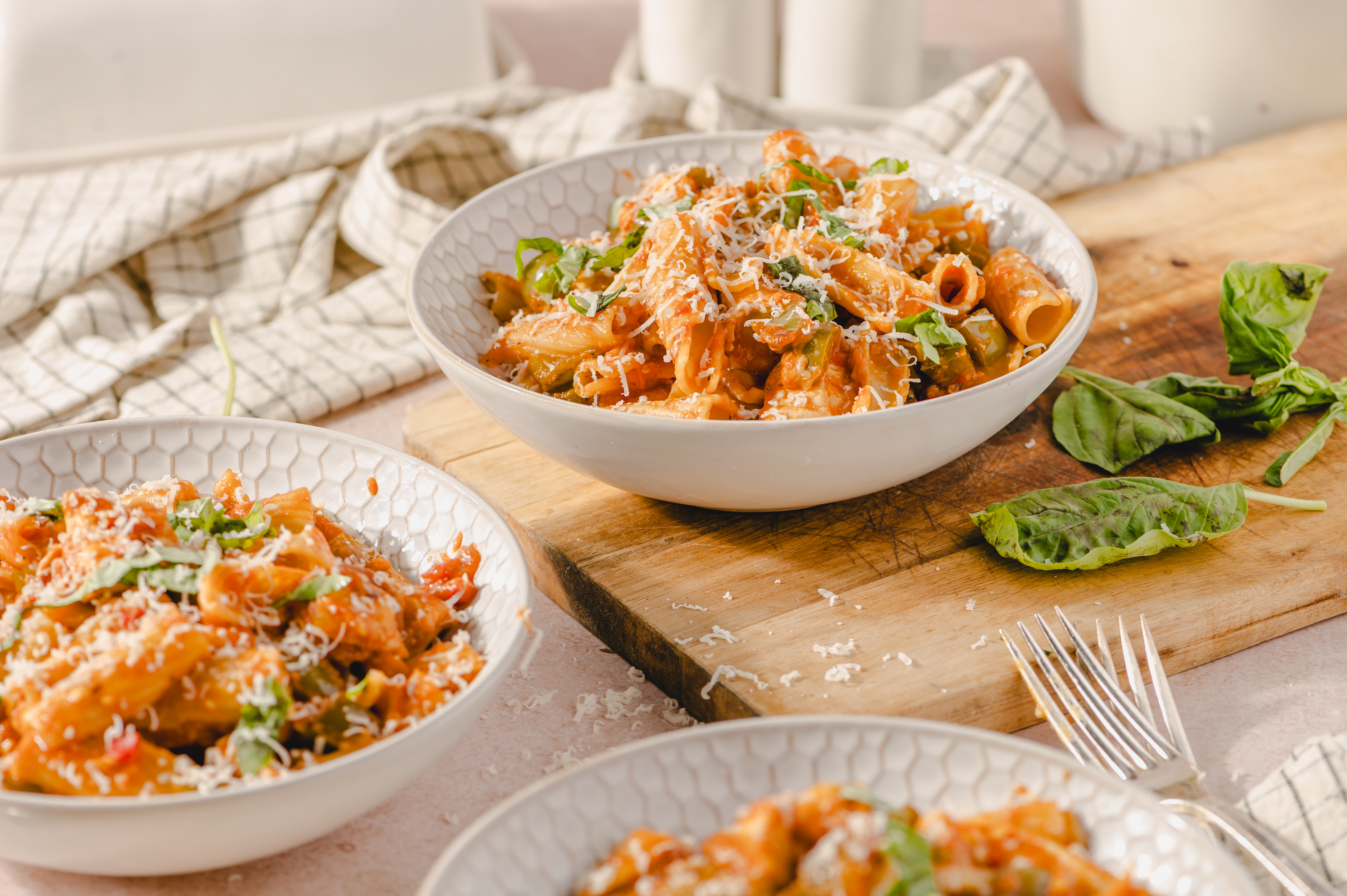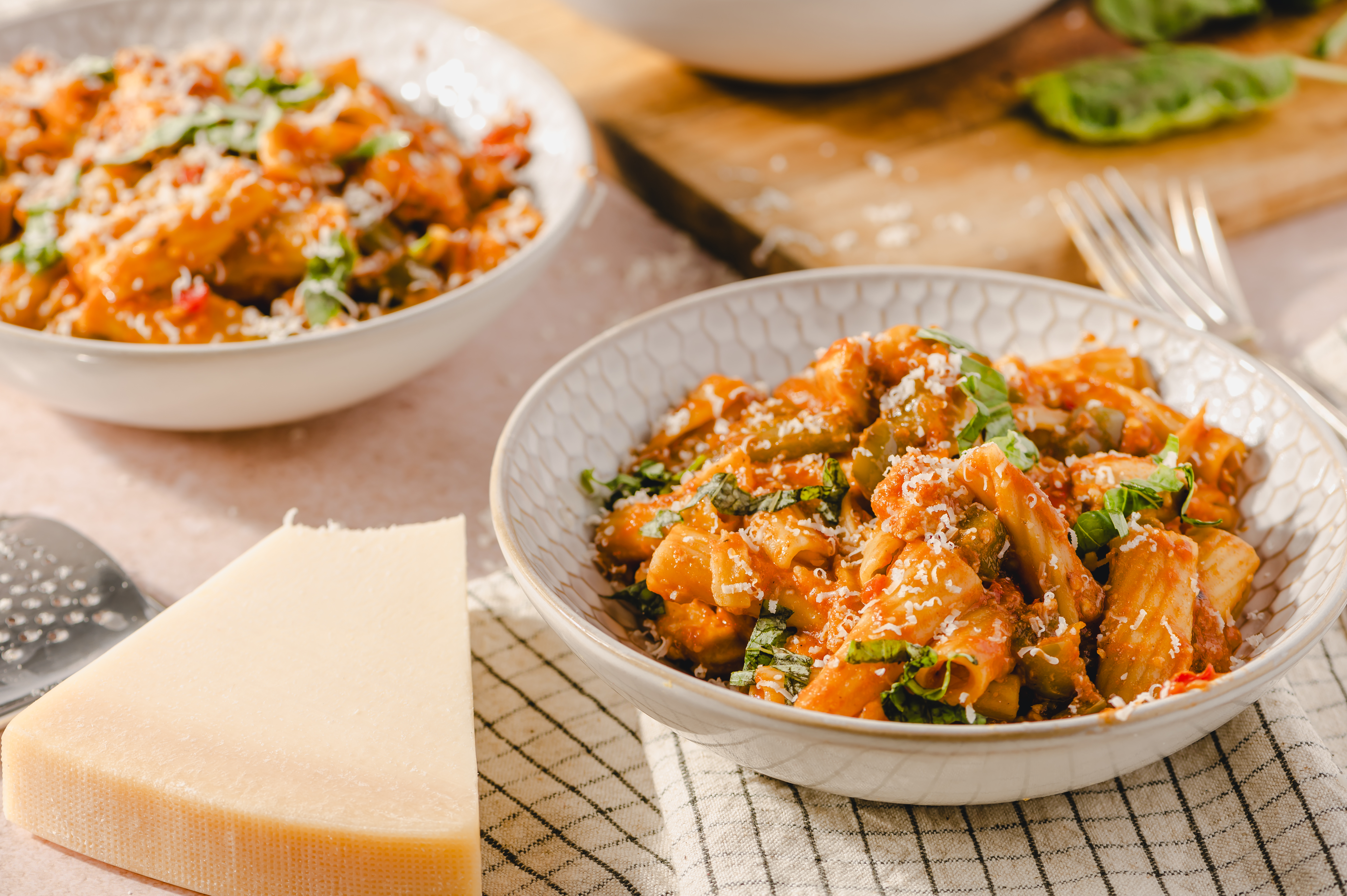 Chicken Rigatoni features more than tender rigatoni and savory chicken. True, it does star the two of them, but they are part of an ensemble cast of sweet-and-sour pickled peppers, a rich white wine and tomato sauce, and sharp parmesan. Refreshing, hearty, and so delicious, Chicken Rigatoni is just a fantastic dinner option for any day of the week!