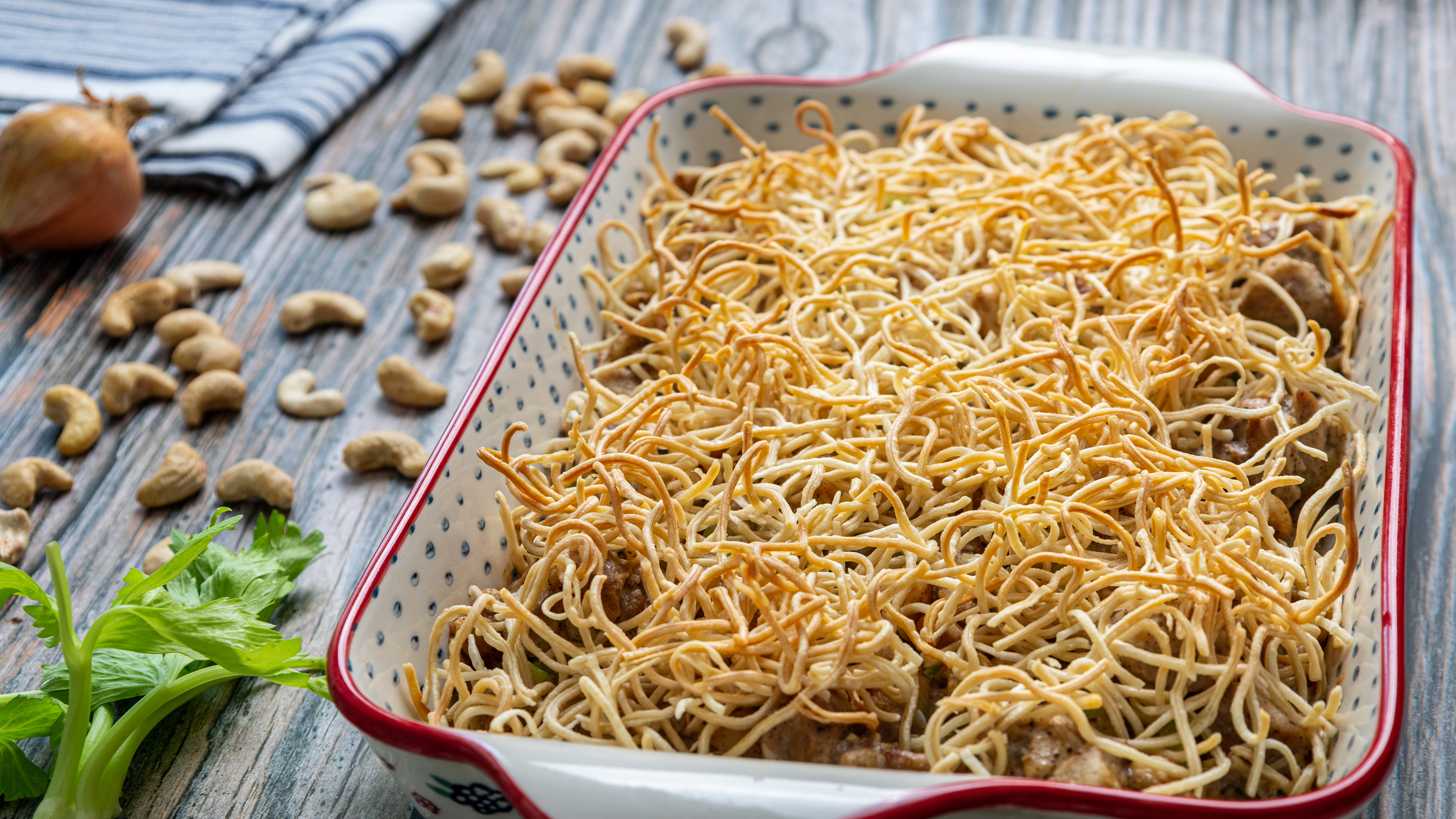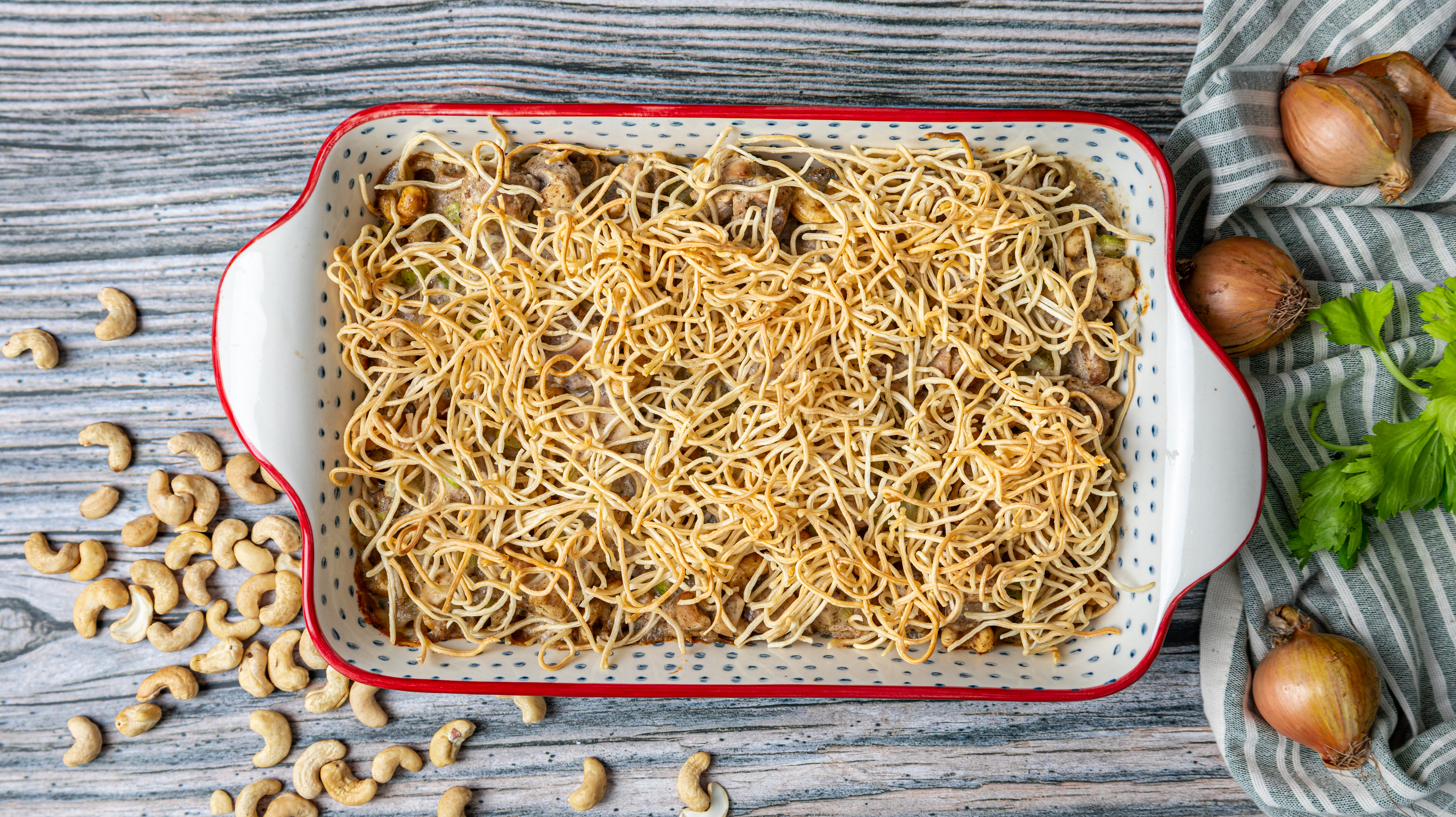 Chinese Cashew Chicken Bake is a fun and breezy casserole that just makes people happy! How could it not? Chicken is always a crowd-pleaser, whether you're cooking for an actual crowd or for your crowd of tastebuds. Cashews add a wonderfully nutty crunch, as do the chow mein noodles on top, and the sauce is filled with wonderful mushroom flavor, savory soy sauce, and sautéed onions. It all comes together to make something amazing: Chinese Cashew Chicken Bake!