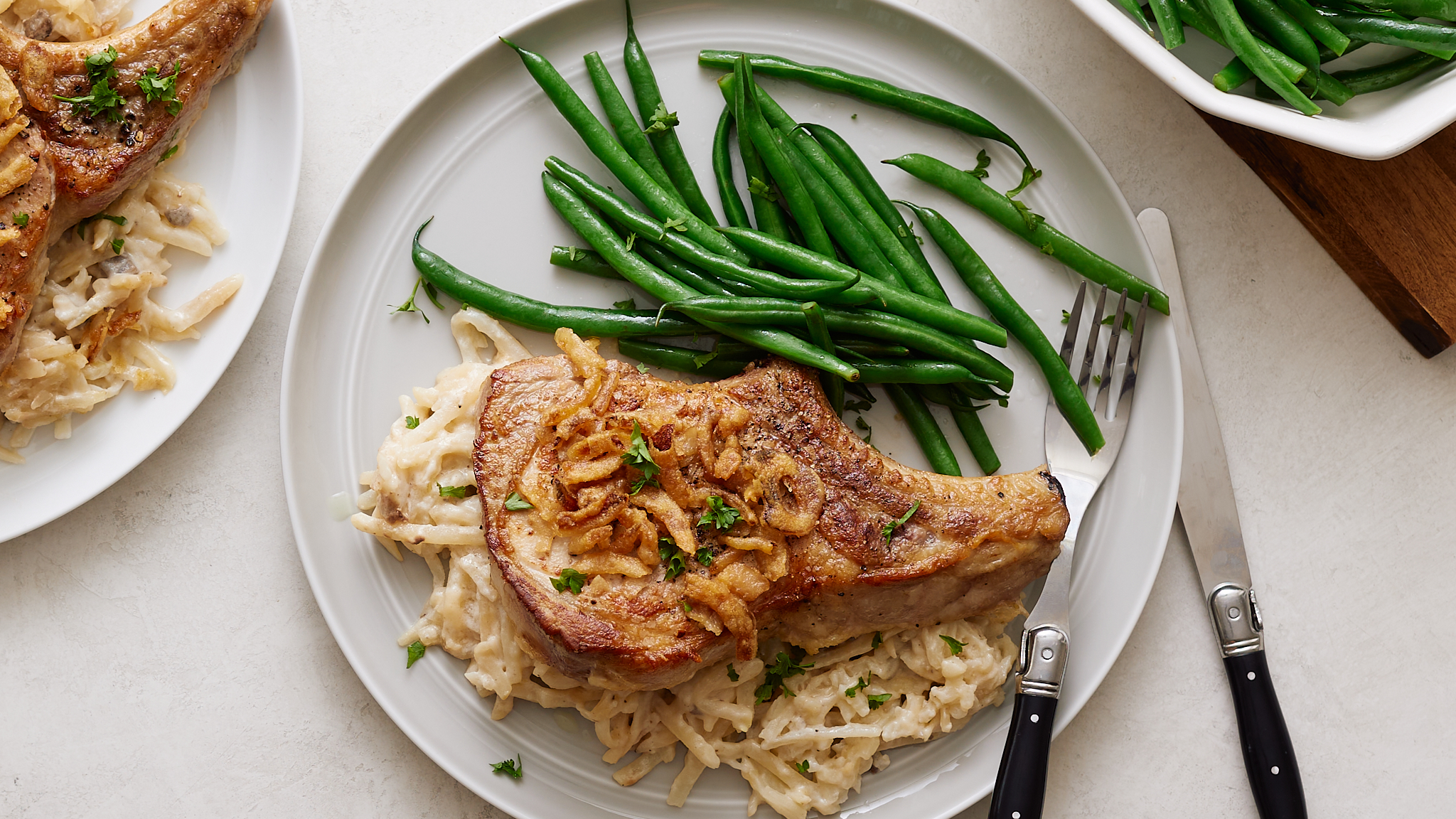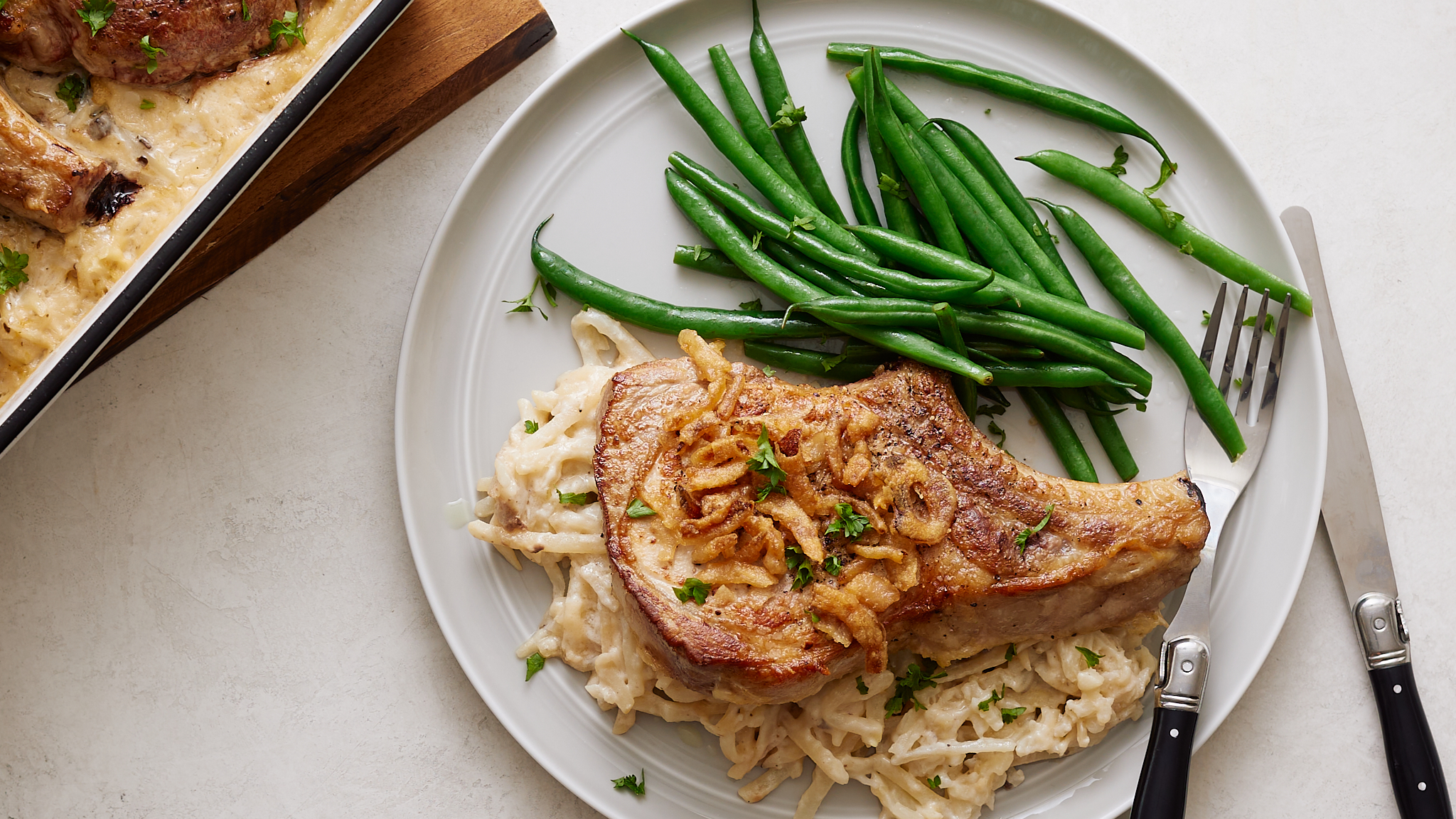 All the best parts of food in a single dish. It's as simple as that. The Creamy Potato & Chop Bake bakes the golden-brown, sweet, and savory pork atop a bed of creamy, cheesy, hearty potatoes... and then everything gets soaked in the delicious drippings. You can tell how succulent each bite tastes with just a glance. The crispy onions on top enhance the savory flavor and add a parade of crunchiness that makes people smile. Th Creamy Potato & Chop Bake is home cooking at its finest!