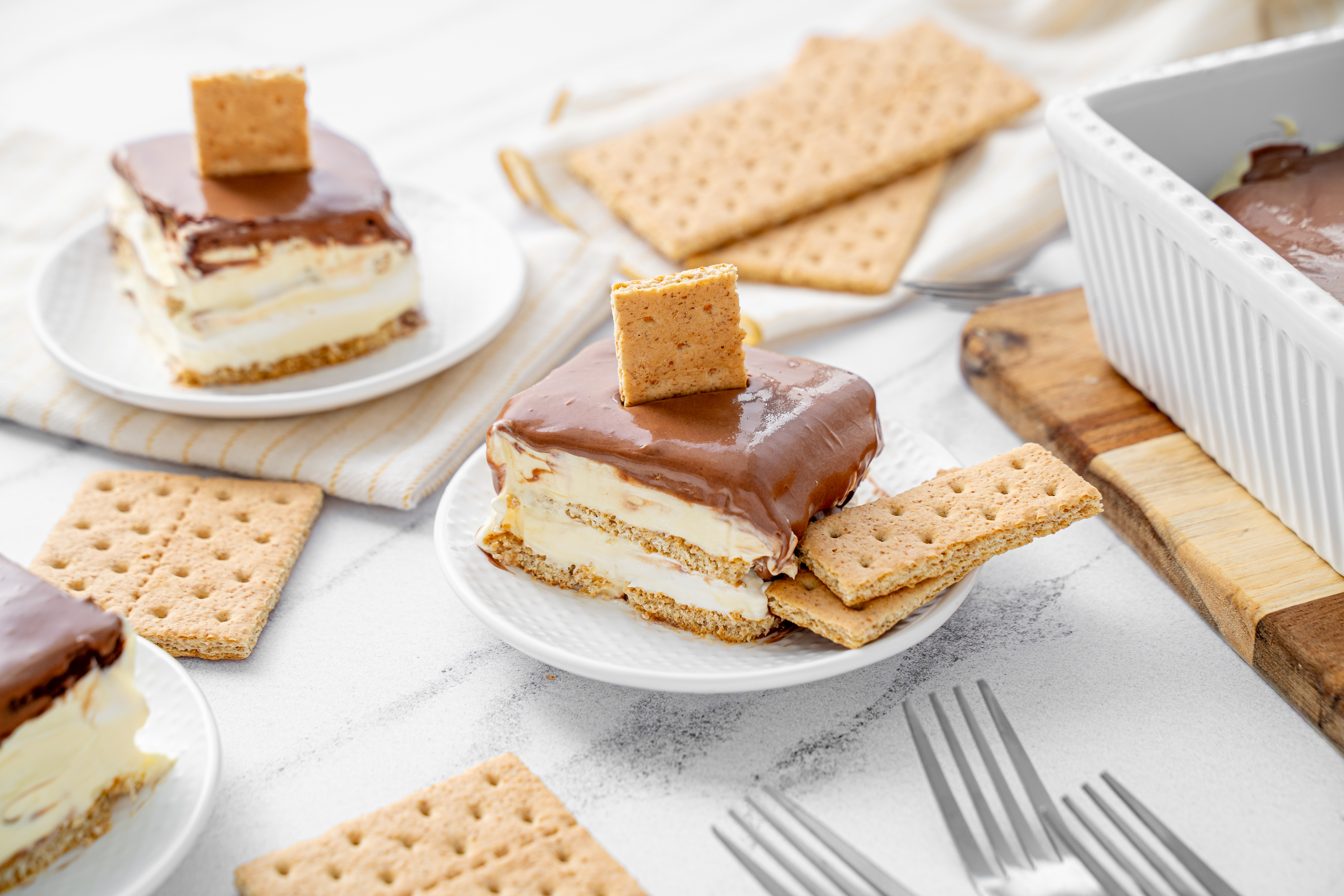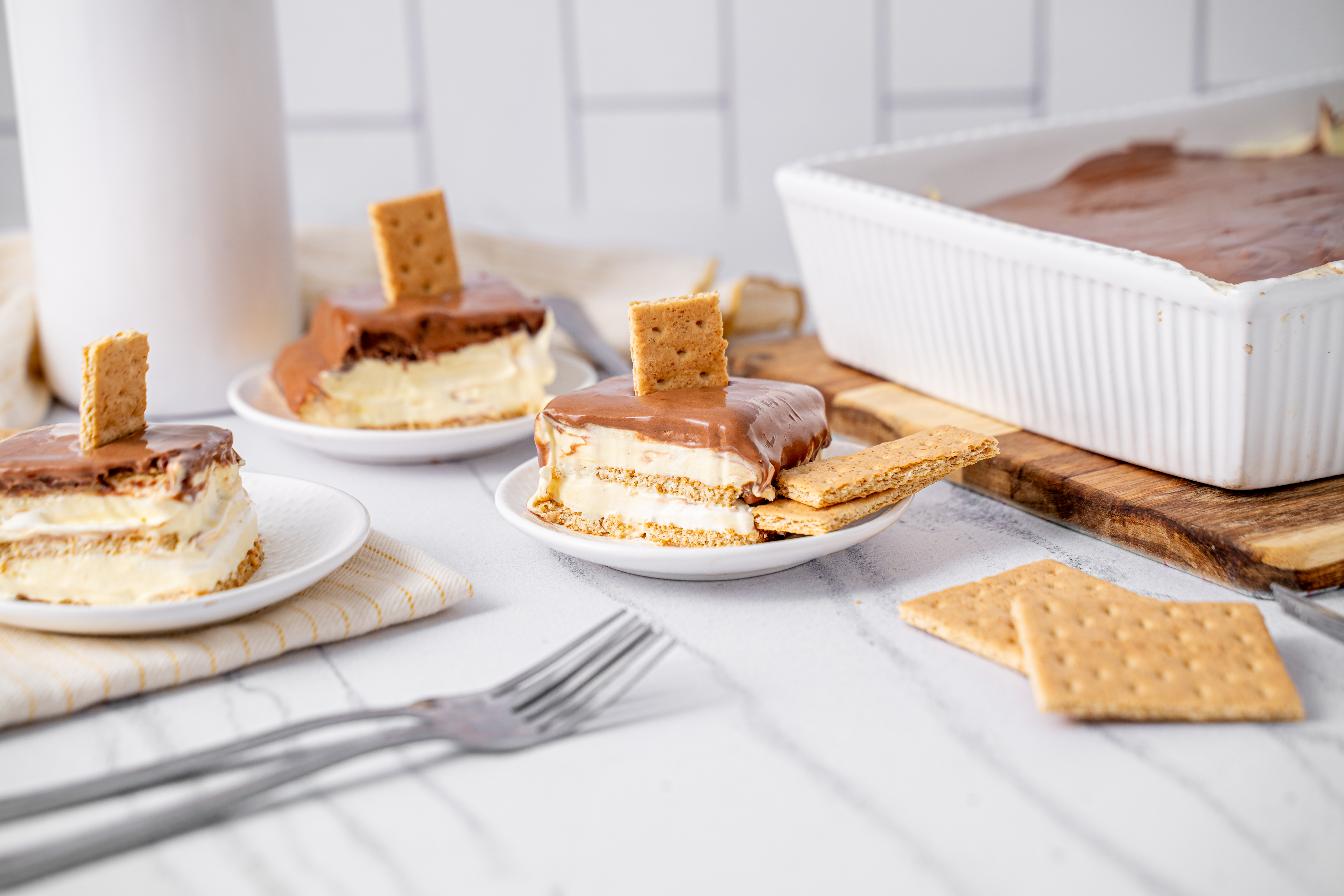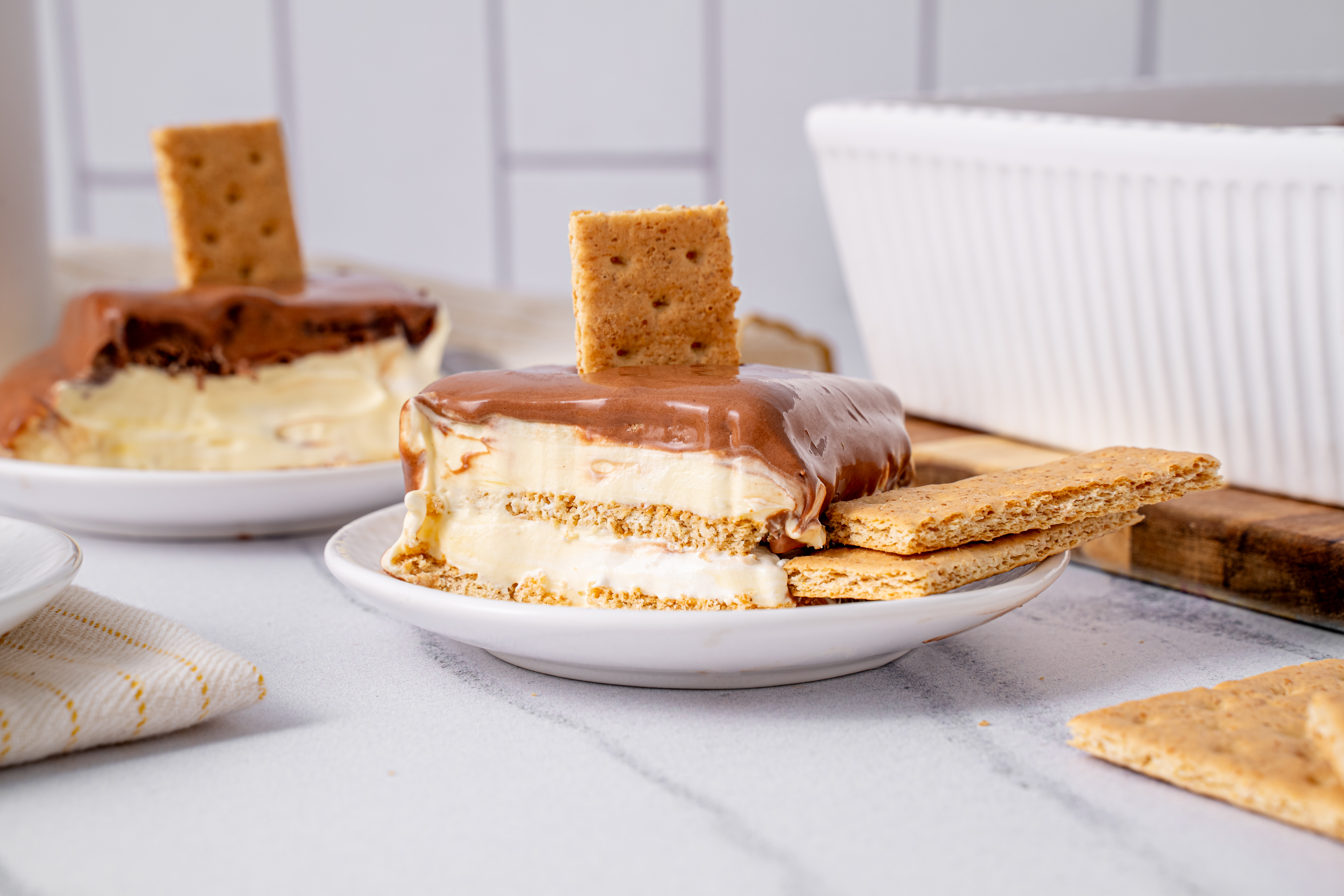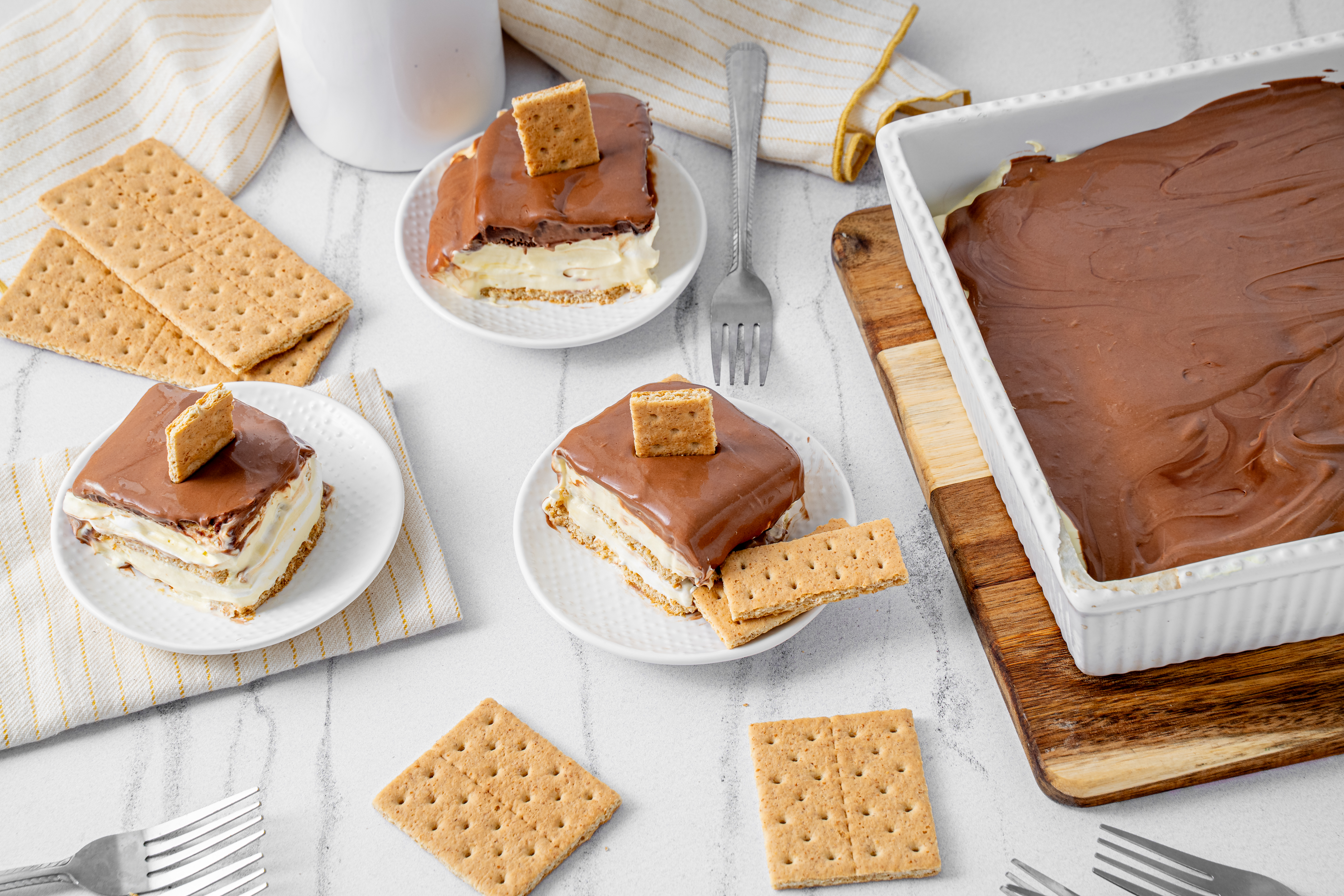 Doesn't the name alone make you scream for joy? Don't you feel like hopping up and down in excitement? It's the Éclair Casserole! It's the perfect mix of the classic French pastry and an icebox cake, using softened graham crackers to replicate the delicate pâte à choux, and a sweet, luscious, creamy filling to replicate the custard filling without even 1/8 of the effort! And then, of course, it is chocolate frosted, because Éclair Casserole is all about that indulgence! Bon appétit!