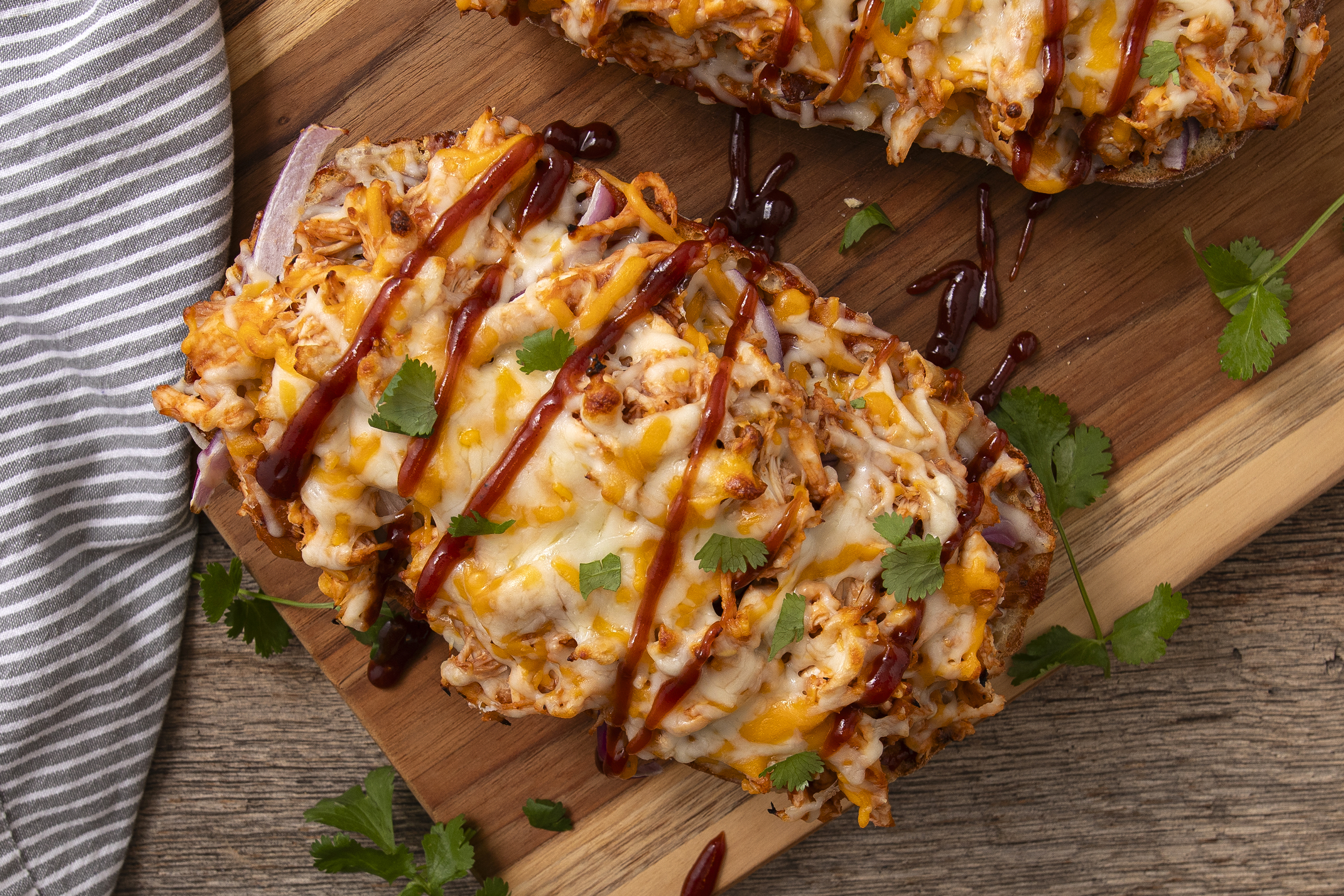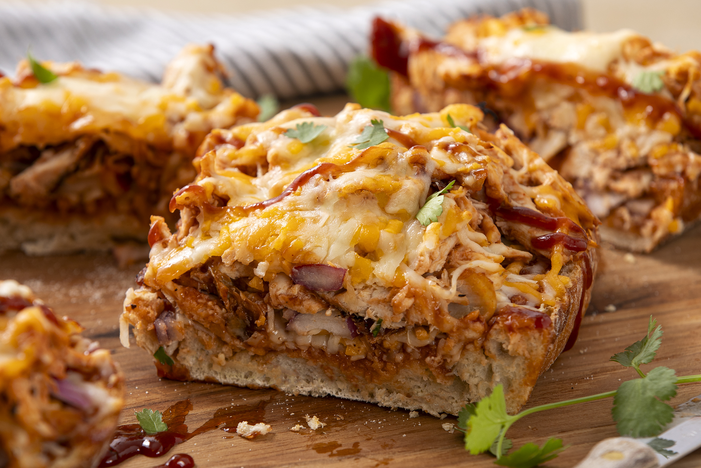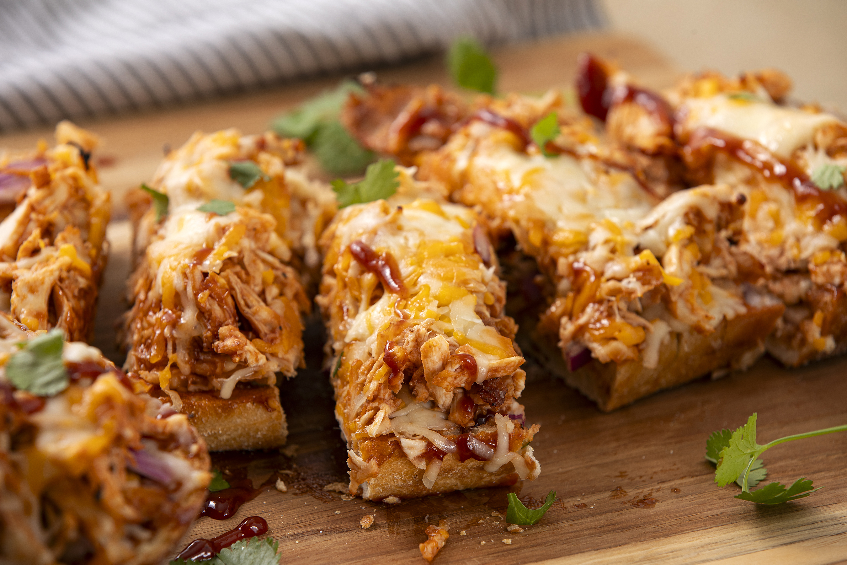 Homemade pizzas sometimes feel like they're missing that special something that delivery pizzas provide. Not anymore! French Bread BBQ Pizza uses buttery French bread as a crust and layers of melty mozzarella and cheddar as the cheese, so it's already on the right track! But then it uses smoky-sweet barbecue sauce instead of marinara and loads up each serving with savory chicken! French Bread BBQ Pizza is delivery-quality fresh from your own oven!