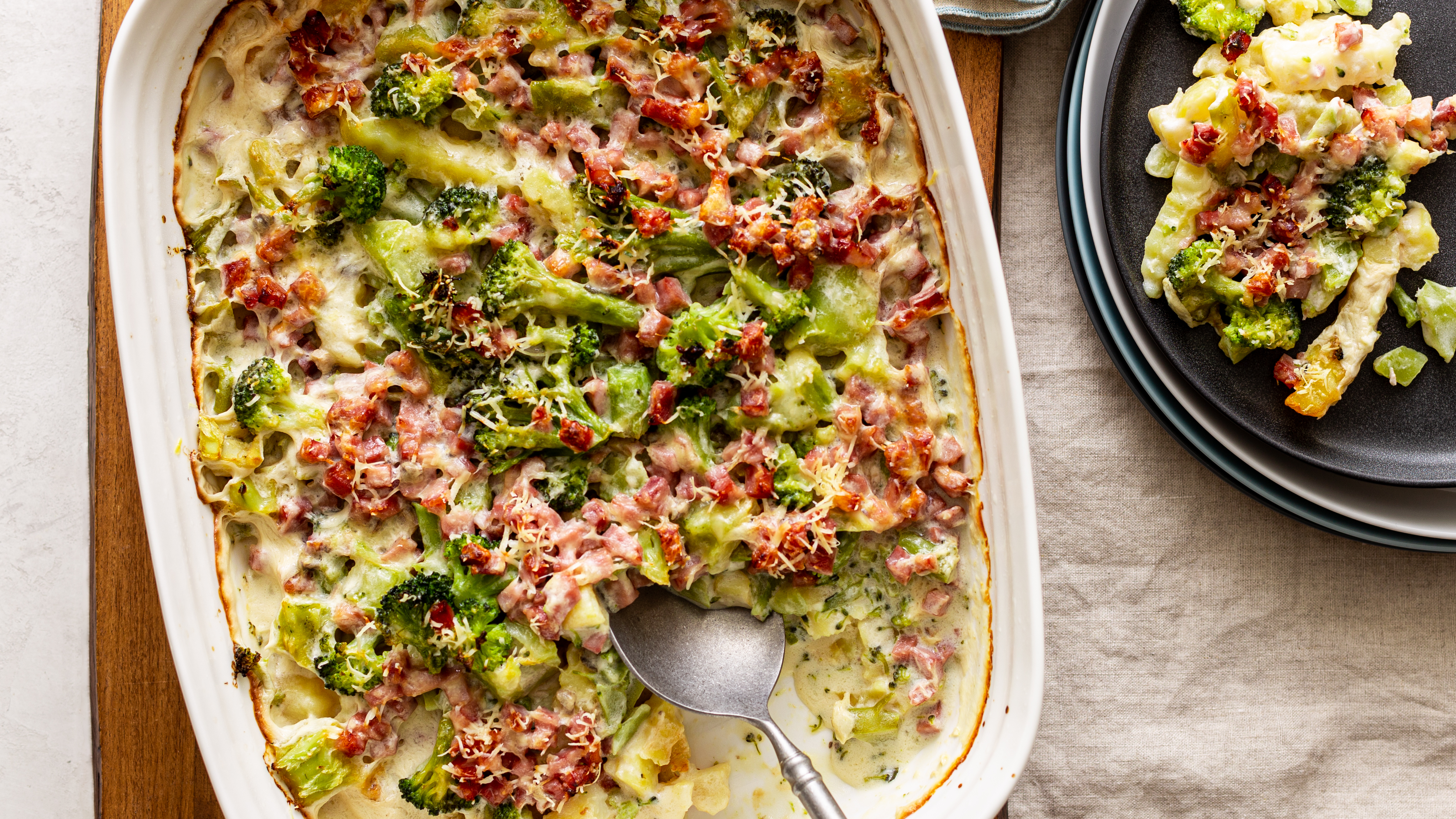Step 5 -Sprinkle the ham evenly over the top of the broccoli.