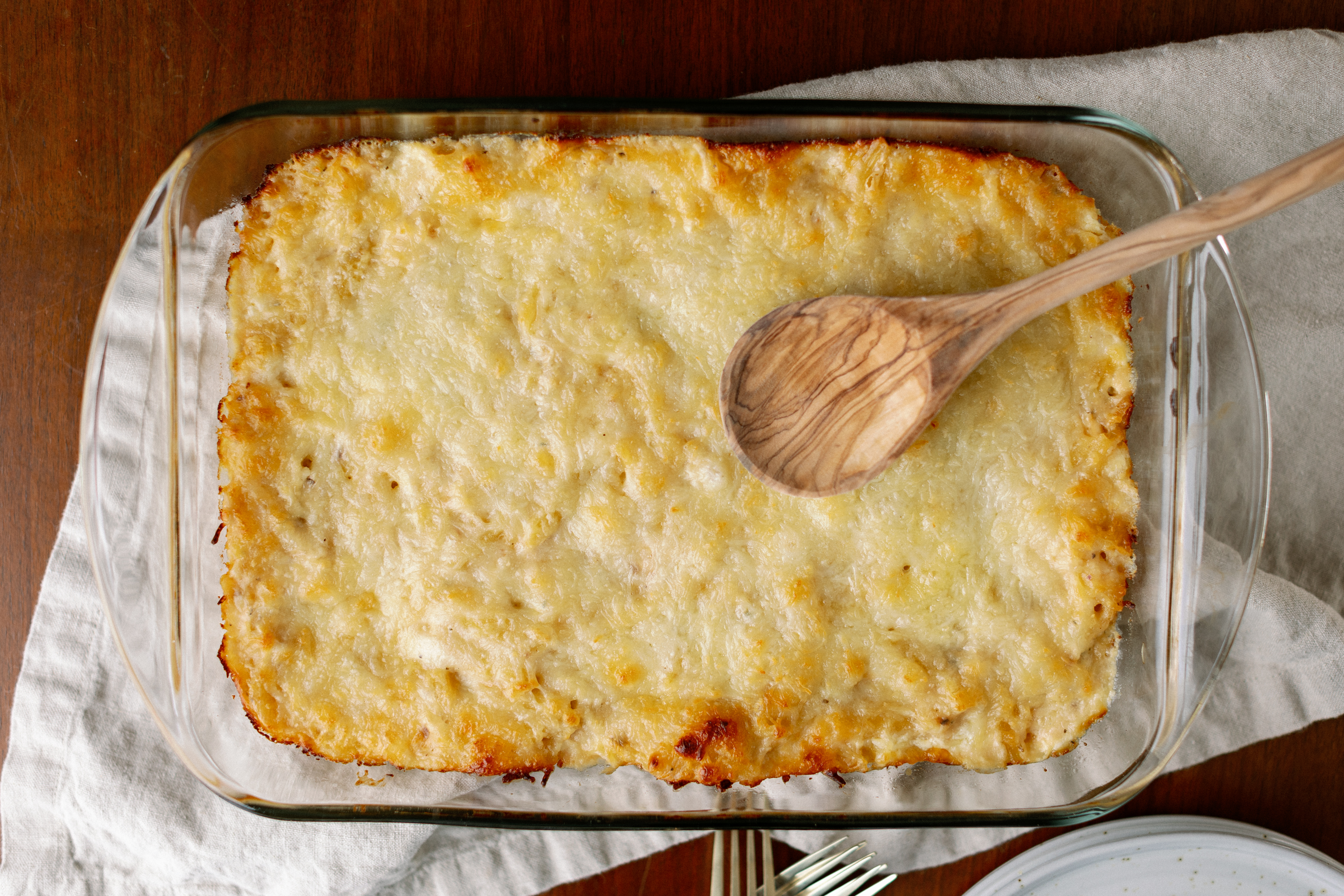 Step 13 -Pour 1/2 of the pasta into the baking dish.