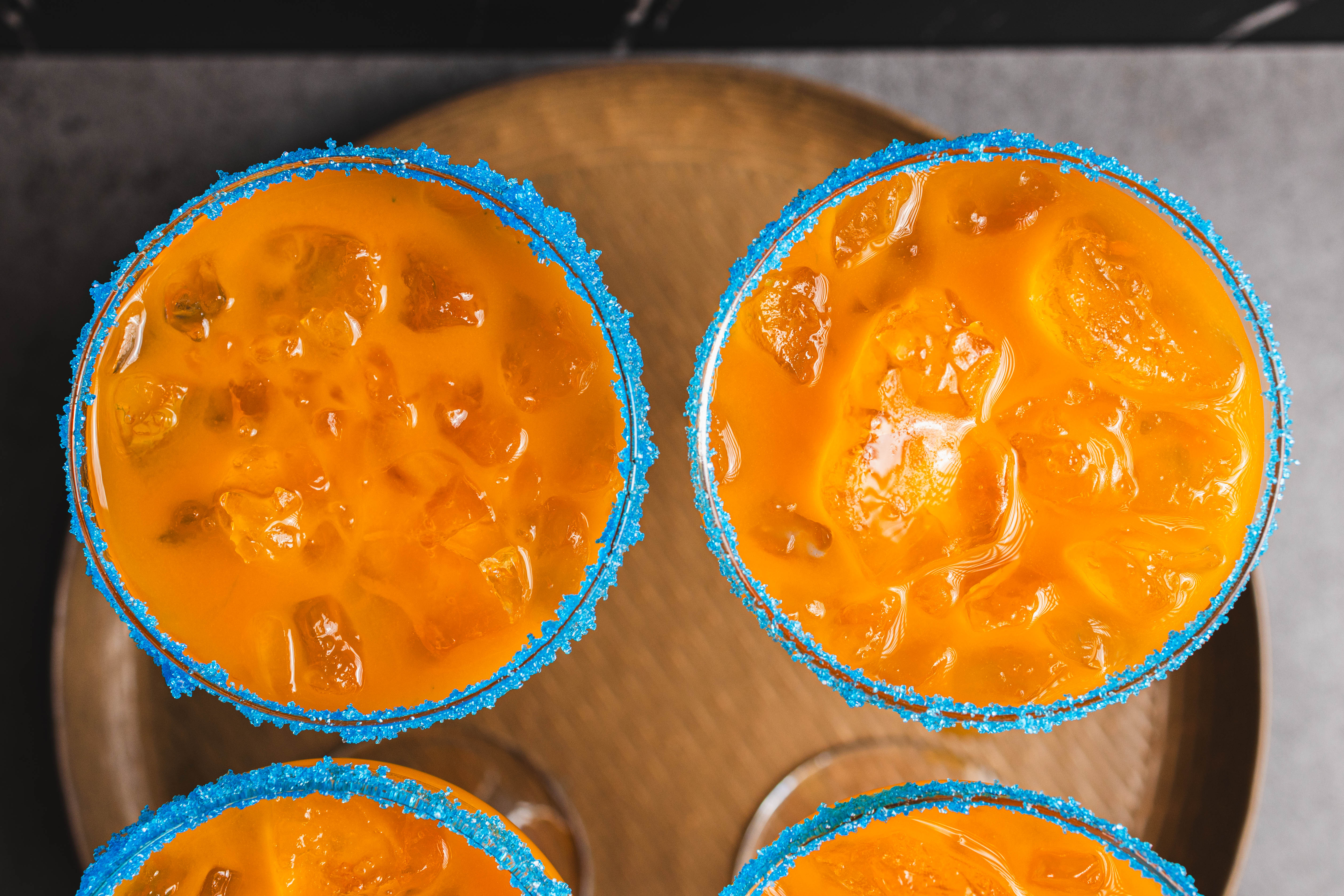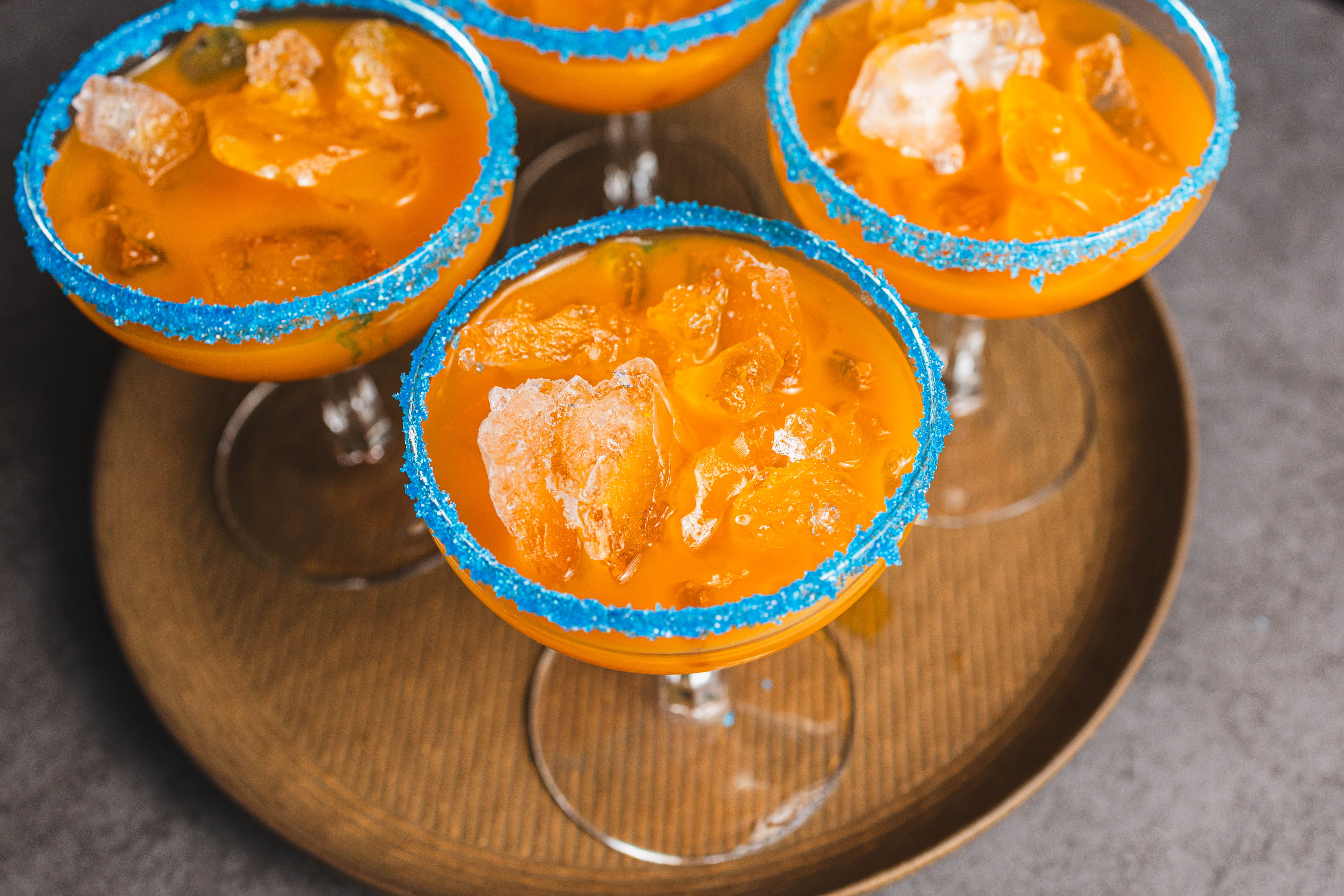 This is the classic margarita experience but without alcohol! Miss Maxine's Fruit Punch is a sunset orange mocktail with the tropical flavors of coconut and mango elevating the beloved flavor of fruit punch! The festive teal sugar rim just makes this sweet beverage all the more whimsical! When the sun is beating down, there's no faster way to cool off than with Miss Maxine's Fruit Punch!