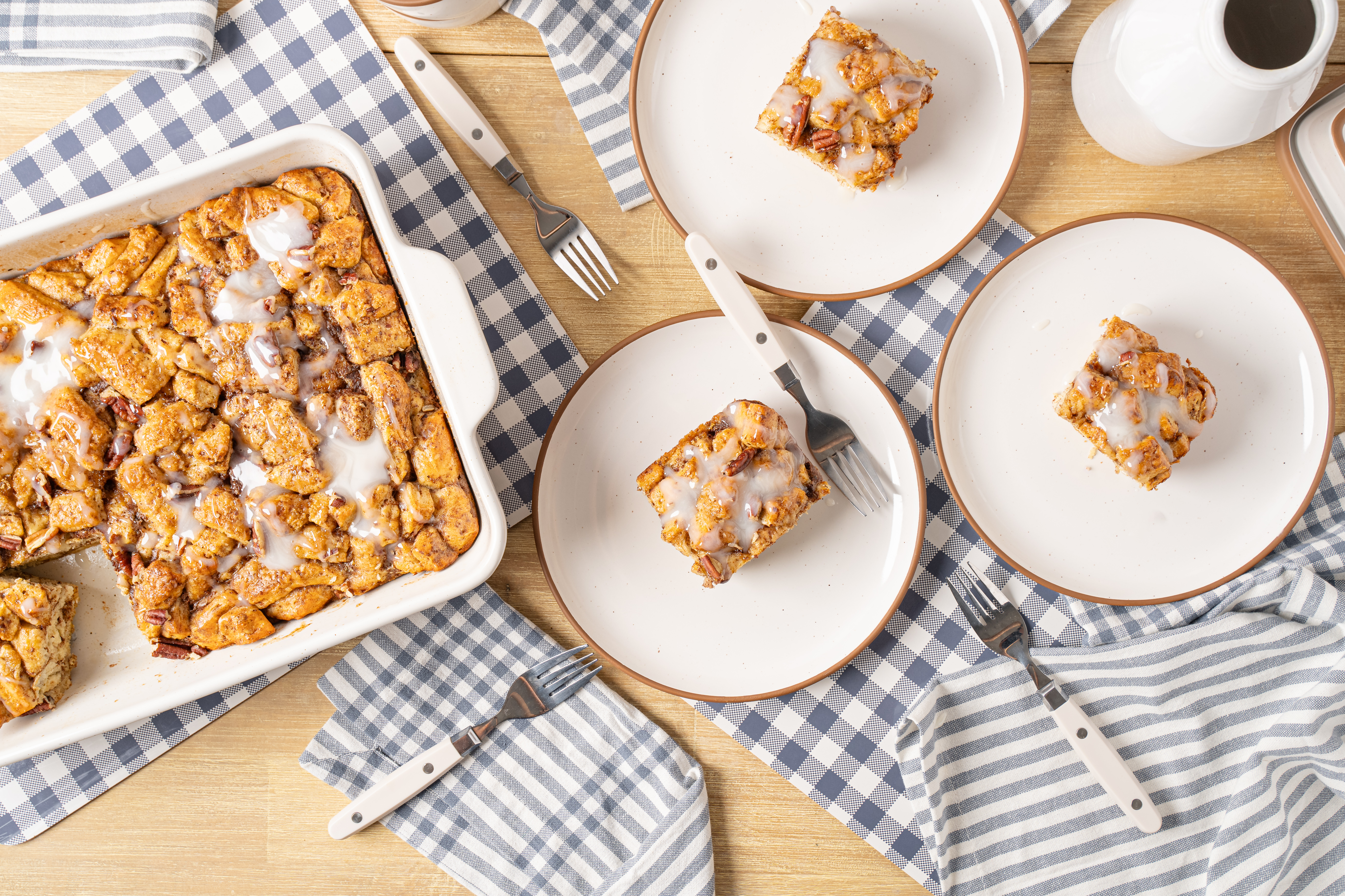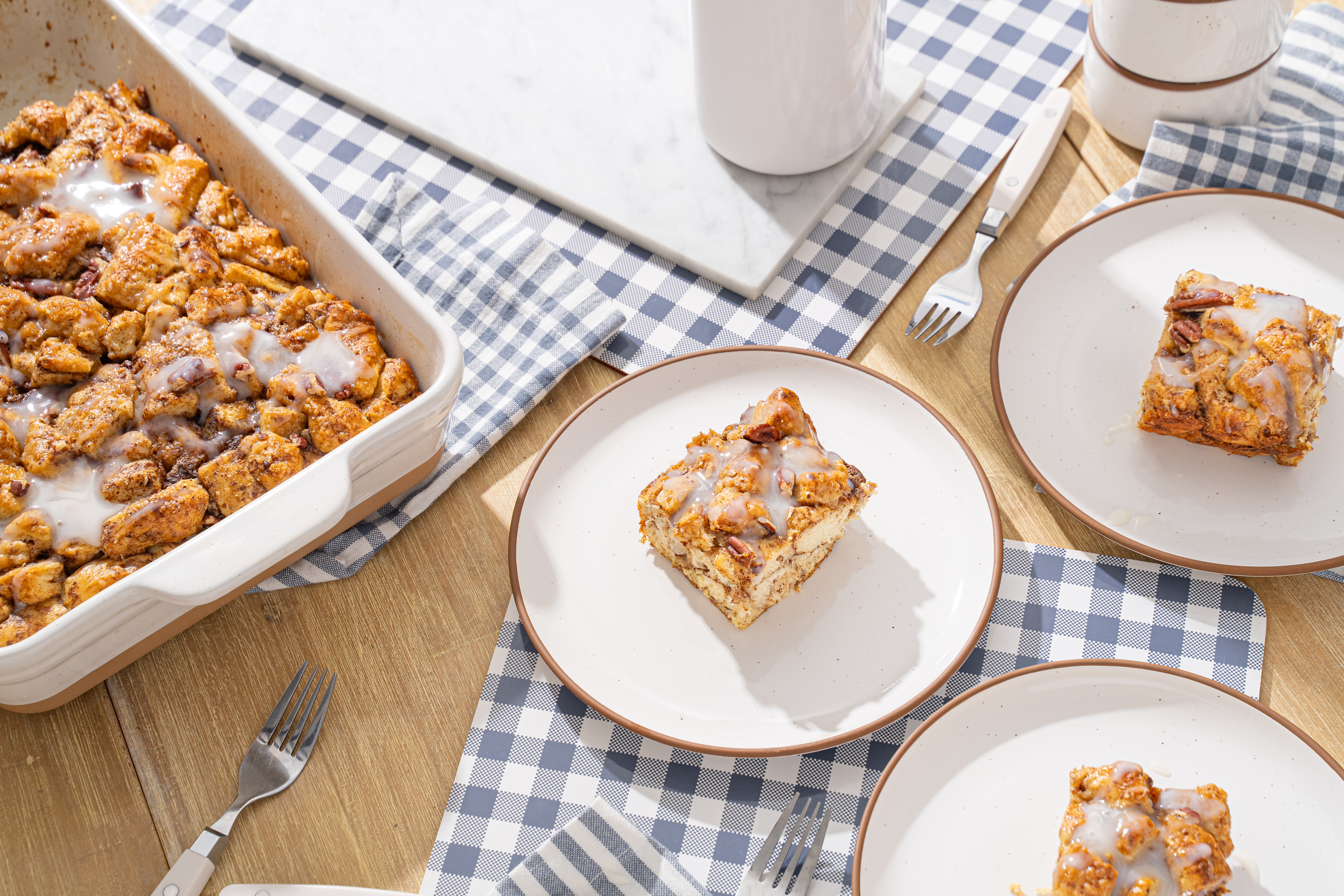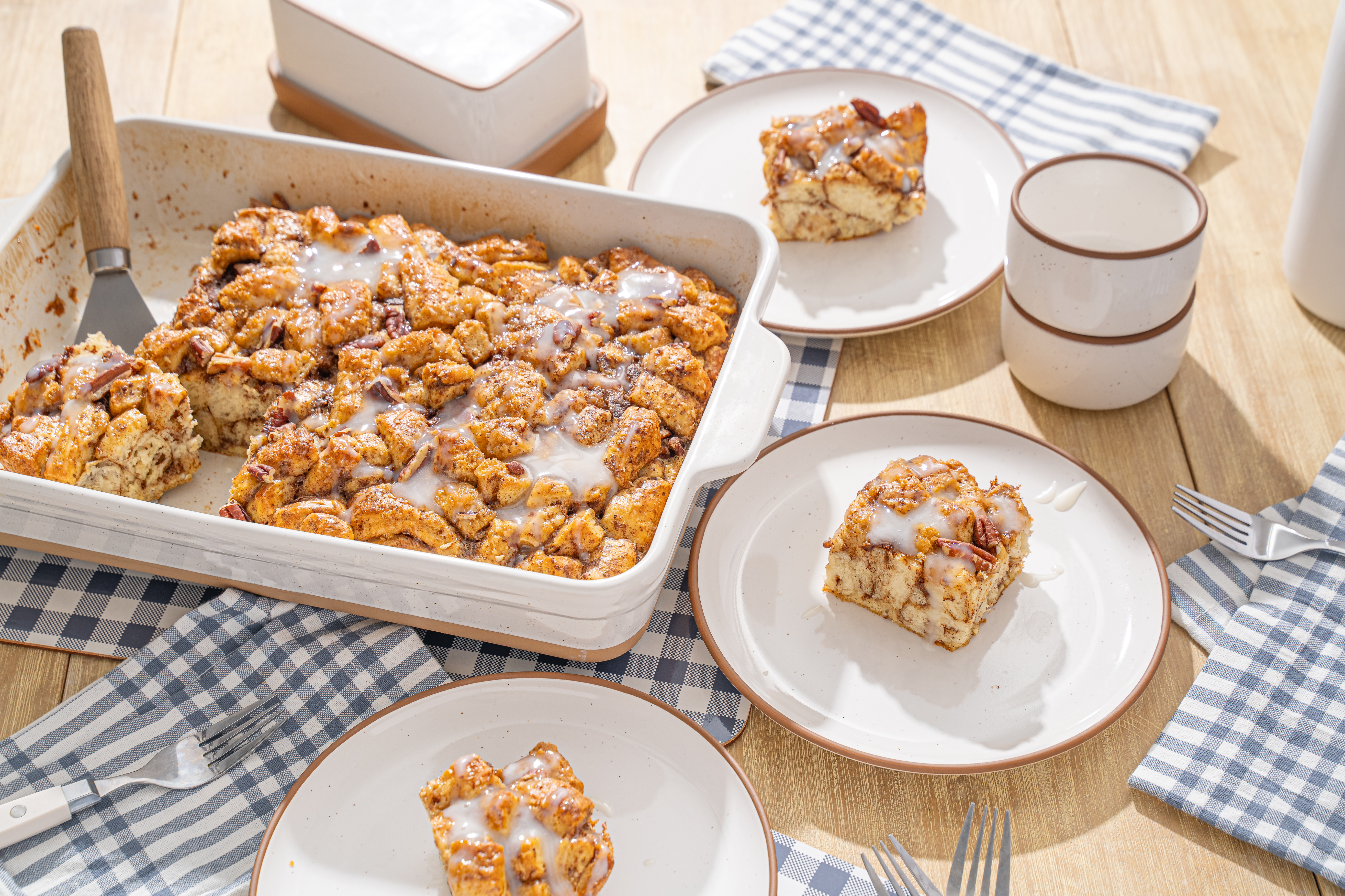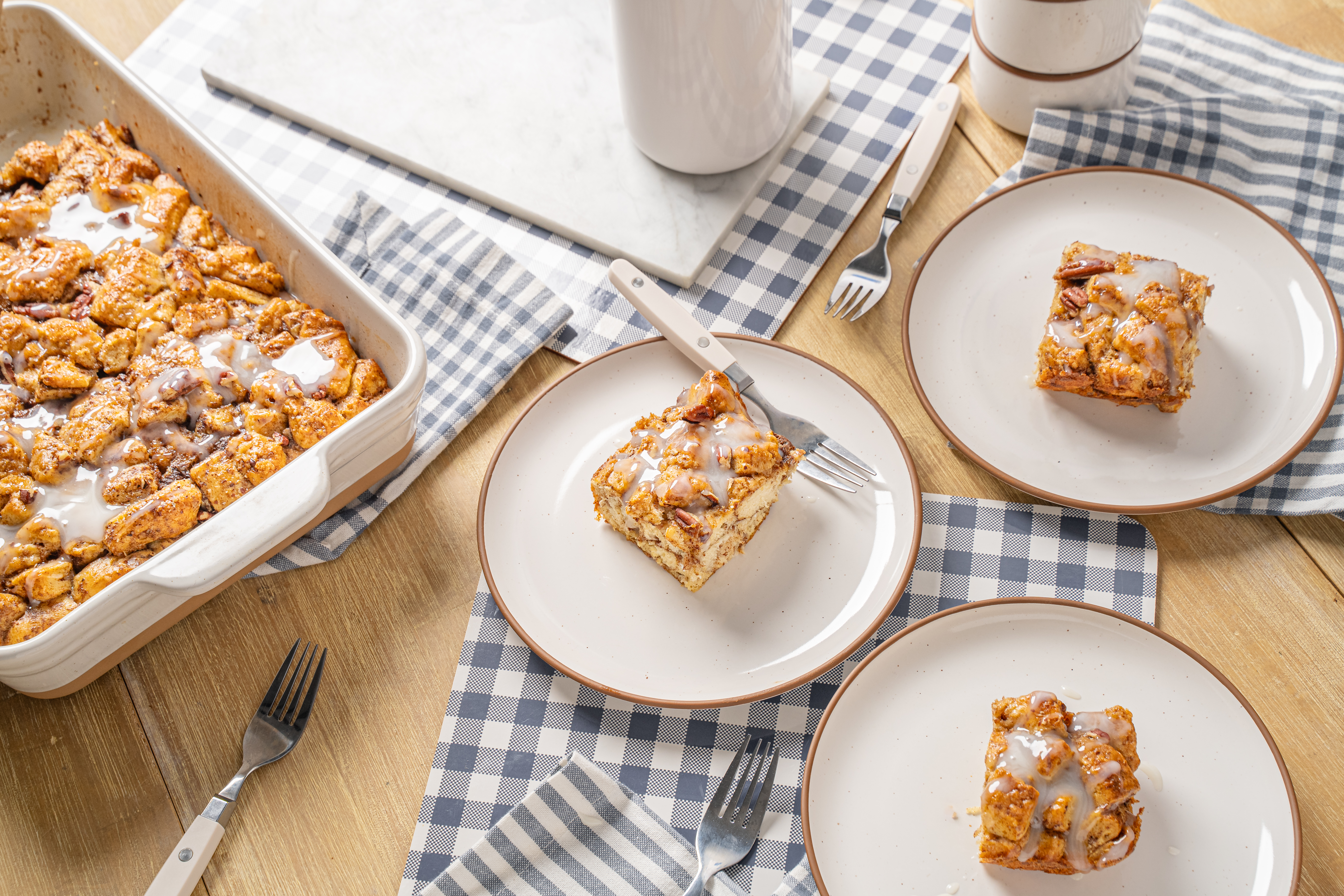 This Sinful Cinnamon Roll Bake really is just that devilishly delicious! Slice after slice of tender, cinnamon-swirled pieces are baked in a creamy custard and topped with brown sugar-coated pecans! Then comes the tangy, creamy frosting on top, because cinnamon rolls need frosting! It's a tried-and-true partnership much like peanut butter and jelly, or slices of Sinful Cinnamon Roll Bake and big smiles!